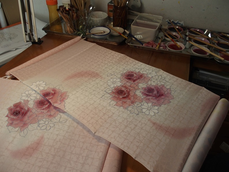 濃淡ぼかしで多数色を常に使うため、花だけ葉っぱだけに分けてさえ、机の上は10~20色の染料でいっぱいになります。それぞれ乾燥しないように濃度を維持して染めるには、図柄を区切りよく何段階かに分けて作業するのが現実的なのです。