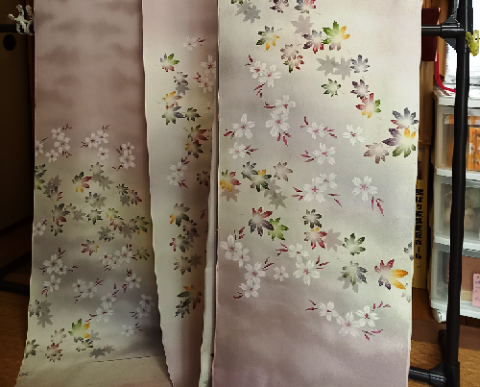 柄行は紅葉と桜。もみじは一番好きなテーマで何度も模様に取り上げてきました。でも一番の問題は季節感がありすぎること。青もみじであれば春も現しますが、赤や黄に色付いた楓などのもみじは「紅葉」と書いて「もみじ」と読むように秋そのもの。せっかくの訪問着の出番が減ってしまう!残念です。