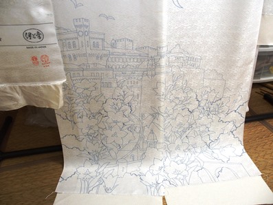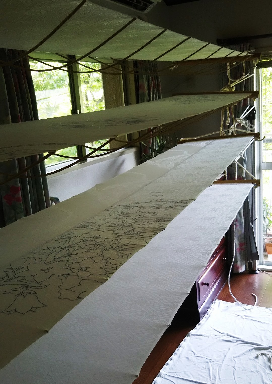 濃淡ぼかしで多数色を常に使うため、花だけ葉っぱだけに分けてさえ、机の上は10~20色の染料でいっぱいになります。それぞれ乾燥しないように濃度を維持して染めるには、図柄を区切りよく何段階かに分けて作業するのが現実的なのです。