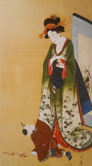 グレーの地色が、前記の歌麿と同じく上半身ほど濃く染められています。こちらの方が粋な大人の女性の感じ。下襲ね(したがさね)はやはり赤。渋い表地と赤の組み合わせは他にもたくさん見かけました。人気の色合わせだったのでしょうね。